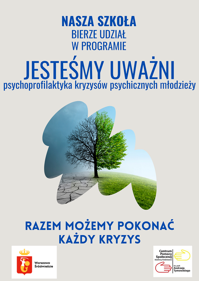 W odpowiedzi na stale rosnącą skalę kryzysów życiowych, w tym psychicznych, tendencji do samookaleczeń i samobójstw wśród młodzieży, Centrum Pomocy Społecznej Dzielnicy Śródmieście im. prof. Andrzeja Tymowskiego (ul. Konwiktorska 3/5, 00 -217 Warszawa tel. 22 628-07-12) przygotowało program psychoprofilaktyki kryzysów psychicznych młodzieży „Jesteśmy Uważni” dedykowany szkołom średnim w Warszawie Śródmieściu. Program będzie realizowany przez zatrudnione w Centrum Pomocy Społecznej konsultantki ds. poradnictwa specjalistycznego w obszarze suicydologii: