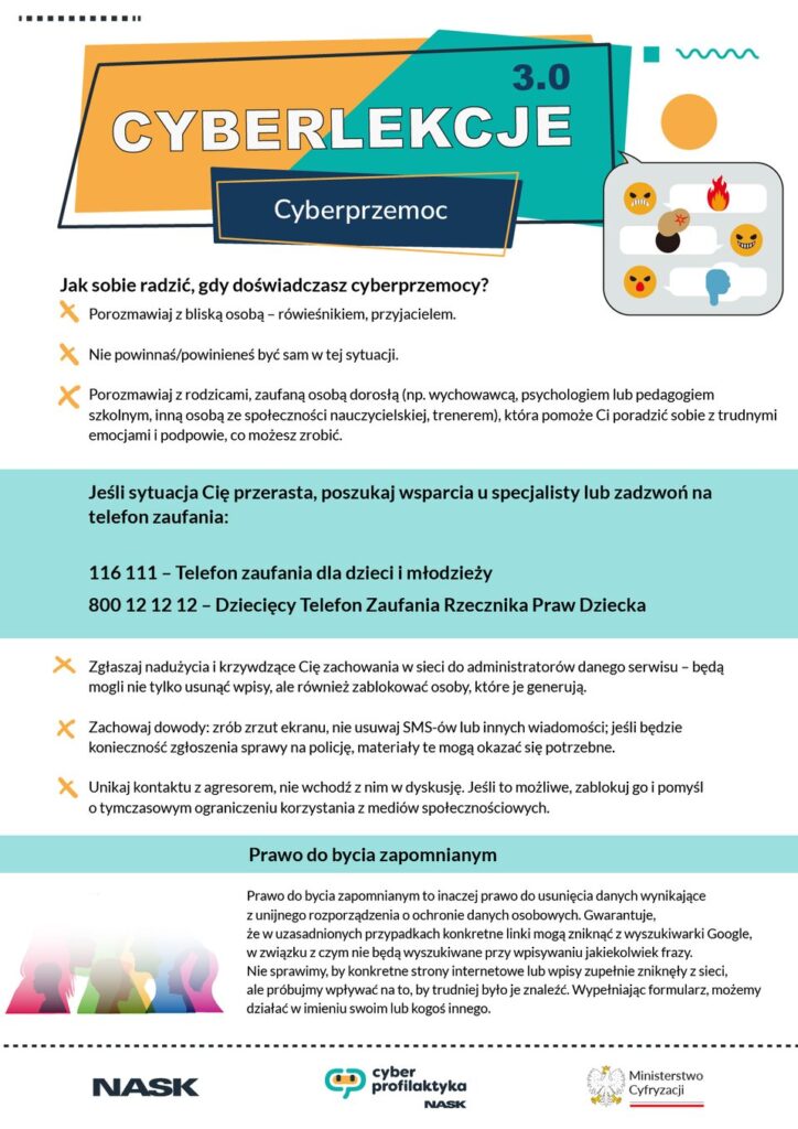 W miesiącu kwietniu w naszej szkole odbędą się specjalne zajęcia wychowawcze w ramach programu Ministerstwa Edukacji Narodowej „Cyberlekcje”. Celem programu jest edukacja uczniów na temat zagrożeń związanych z cyberprzemocą oraz promowanie bezpiecznego korzystania z internetu.