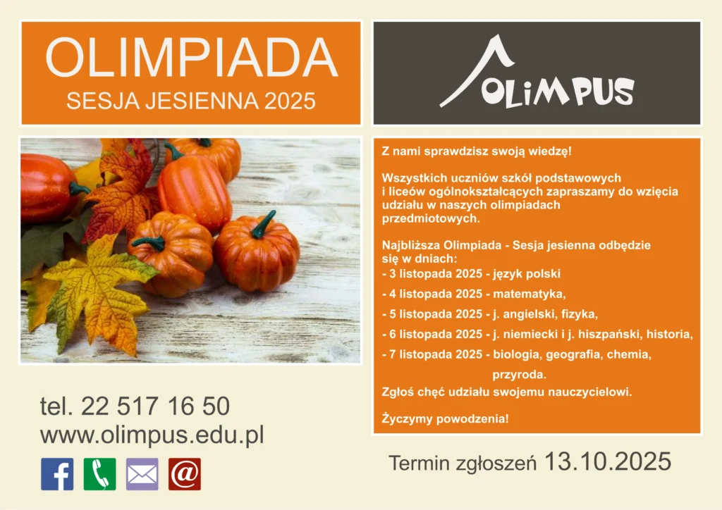 Zapisy odbywają się do końca października. Poniżej przesyłam Państwu zakres materiału jaki będzie obowiązywał podczas Olimpusa. Jeśli chodzi o moich uczniów przede wszystkim z klas drugich i trzecich postaram się chętnych uczniów przygotować ponieważ nie mamy zrealizowanych wszystkich działów, jednak klasy pierwsze na spokojnie są przygotowane z zakres materiału. Chętnym uczniom będę podsyłał zadania do wykonywania w domu związku z tym zachęcam do zapisów!